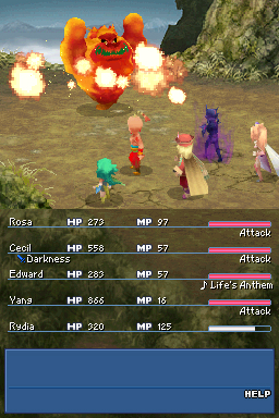 The most obvious addition to the DS version is the complete facelift it was given. The entire game is fully rendered in 3D, making full use of the DS’s capabilities with only some rare slowdown. Animations during the cutscenes are incredibly smooth, and when layered with exceptional voice work, can make for a cinematic experience that rivals home console RPGs… even if it is a bit more blocky and blurry. It is hard to deny that the production values for Final Fantasy IV are staggering.